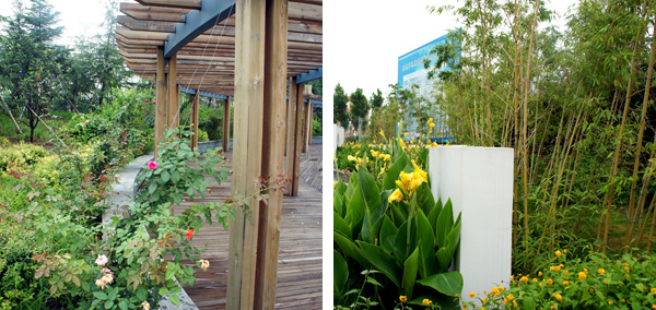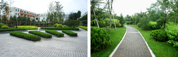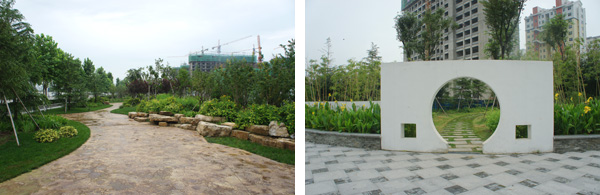 每個(gè)景觀節(jié)點(diǎn)上,植物的配置方法都是不一樣的,如在下沉廣場,主要是以小龍柏、金葉女貞等小灌木片植成方形或弧形,間或點(diǎn)綴石楠、梅樹,看起來規(guī)整、簡潔;而在設(shè)計(jì)風(fēng)格為江南園林的南廣場上,是將貴重的造型油松單植,通過不同的組合,形成三個(gè)風(fēng)格相近的綠島,周邊種植美人蕉、玉簪、竹子,并砌起白墻,上面開圓形拱門或圓窗,散發(fā)出詩意江南的靜謐和婉約氣息。"游憩步道是貫穿整個(gè)景觀的軸線,為了形成曲徑通幽的景觀效果,我們將對植、孤植、叢植都多種方法結(jié)合運(yùn)用,特別是在三叉路口,多種植海棠、櫻花、杏花等,一方面,花開的時(shí)候,綠葉間繁花點(diǎn)點(diǎn),會吸引人們不斷向前探尋更多的美景;而花落之后,茂密的枝葉又形成隱隱約約的視覺感受,前方轉(zhuǎn)過彎后風(fēng)景什么樣,又讓人很想去看看。"高經(jīng)理笑著說。