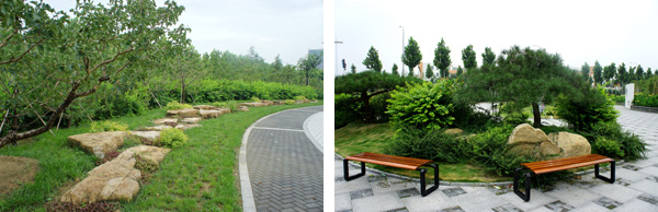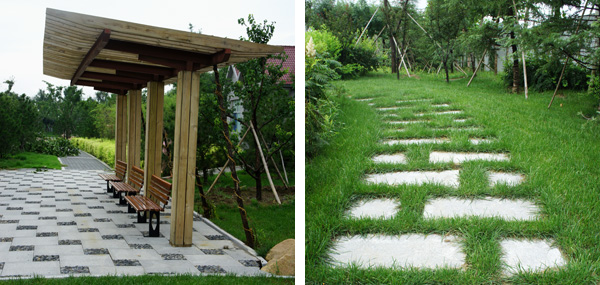 而在道路十字路口的節(jié)點(diǎn)處,則主要是用10cm×10cm的小花崗巖鋪地,鋪出來的路面整潔、平坦,看似簡單,實(shí)則對施工技術(shù)要求相當(dāng)高。草坪中的地面鋪裝,則采用花崗巖汀步,用錯(cuò)縫鋪裝法,兩塊花崗巖之間用草皮鑲嵌,就像給每塊花崗巖鑲了一道綠邊,與旁邊的草坪和諧地融為一體。貫穿整個(gè)工程的游憩步道,全部采用"人字形"的鋪裝方法,中間用透水磚、兩邊以花崗巖鑲邊,透水磚價(jià)格不高,用以鑲邊的花崗巖是利用了鋪裝中剩余的邊料,雖然用料簡單,但通過對技術(shù)的嚴(yán)格要求,鋪出的路面卻整潔而不失韻味,是一種實(shí)用、環(huán)保、節(jié)約的做法。