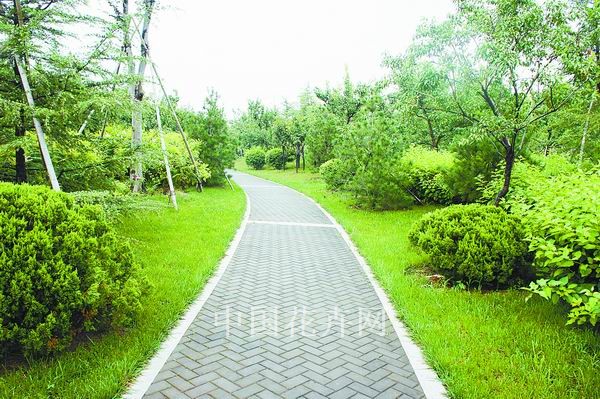 而在道路十字路口的節(jié)點處,則主要是用10厘米×10厘米的小花崗巖鋪地,鋪出來的路面整潔、平坦,看似簡單,實則對施工技術要求相當高。草坪中的地面鋪裝,則采用花崗巖汀步,用錯縫鋪裝法,兩塊花崗巖之間用草皮鑲嵌,就像給每塊花崗巖鑲了一道綠邊,與旁邊的草坪和諧地融為一體。貫穿整個工程的游憩步道,全部采用“人字形”的鋪裝方法,中間用透水磚、兩邊以花崗巖鑲邊,透水磚價格不高,用以鑲邊的花崗巖是利用了鋪裝中剩余的邊料,雖然用料簡單,但通過對技術的嚴格要求,鋪出的路面整潔而不失韻味,是一種實用、環(huán)保、節(jié)約的做法。