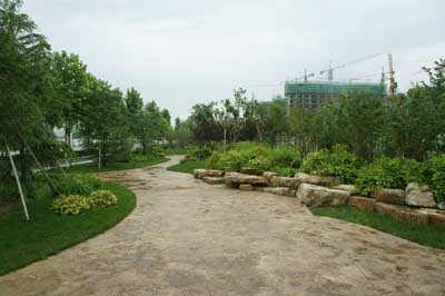 為了配合每個(gè)景觀節(jié)點(diǎn)的風(fēng)格,園路的鋪裝材料和手法各不相同。據(jù)高經(jīng)理介紹,工程中用到的鋪裝材料主要有汀布石、印花地坪、文化石、青磚、荷蘭磚、花崗巖等,其中,印花地坪是一種新型的鋪裝材料?!坝』ǖ仄褐饕迷诒睆V場(chǎng)上,其工藝為:在混凝土上面灑上特殊的配料,整平之后,再用模具一塊一塊壓出形狀,最后用特殊的膠水封膜,這種施工方法工藝新穎,花樣和顏色比較多,雖然工藝較為復(fù)雜,但是景觀效果非常好,遠(yuǎn)遠(yuǎn)看去,就如盛開在腳下的‘花?!?,一路迤邐而去?!备呓?jīng)理說,“其他的鋪裝材料雖然比較常見,但我們?cè)阡佈b工藝上進(jìn)行了創(chuàng)新,如在下沉廣場(chǎng)的廊架旁,我們用黑色的鵝卵石與芝麻灰的花崗巖搭配,鋪出來的路面呈現(xiàn)出立體感,這種鋪裝工藝是借鑒了室內(nèi)裝飾的手法,通過改造,用于室外鋪裝,遠(yuǎn)遠(yuǎn)看去,就像一級(jí)一級(jí)的臺(tái)階,帶動(dòng)了周圍的景觀也動(dòng)起來。”