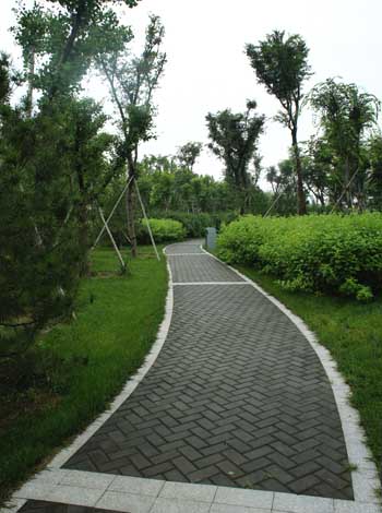 而在道路十字路口的節(jié)點(diǎn)處,則主要是用10cm×10cm的小花崗巖鋪地,鋪出來的路面整潔、平坦,看似簡(jiǎn)單,實(shí)則對(duì)施工技術(shù)要求相當(dāng)高。草坪中的地面鋪裝,則采用花崗巖汀步,用錯(cuò)縫鋪裝法,兩塊花崗巖之間用草皮鑲嵌,就像給每塊花崗巖鑲了一道綠邊,與旁邊的草坪和諧地融為一體。貫穿整個(gè)工程的游憩步道,全部采用“人字形”的鋪裝方法,中間用透水磚、兩邊以花崗巖鑲邊,透水磚價(jià)格不高,用以鑲邊的花崗巖是利用了鋪裝中剩余的邊料,雖然用料簡(jiǎn)單,但通過對(duì)技術(shù)的嚴(yán)格要求,鋪出的路面卻整潔而不失韻味,是一種實(shí)用、環(huán)保、節(jié)約的做法。
