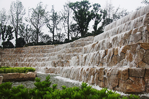 入口水景開闊大氣,行道樹陣整齊劃一。一場歌劇的序曲,不管是澎湃激昂,還是歡快活躍,抑或是柔情舒緩,都將對整個局情起著舉足輕重的作用。入口景觀的作用同樣如此,它是整個園林工程留給人們的第一印象。走進(jìn)項(xiàng)目主入口,寬40米、高10米的寬闊水景,高達(dá)7級的層階落差,水流層層跌落間,水聲轟鳴,仿佛一道瀑布橫掛眼前。3000平方米的地面鋪裝,全部采用50毫米厚的深灰色和芝麻白花崗巖,走在上面,平坦、踏實(shí)。兩側(cè)的花壇,邊緣鋪設(shè)手法也呈臺階狀,蘑菇石貼面,花崗巖壓邊,與水景遙相呼應(yīng)?;▔械闹参?,上層選用香樟、銀杏、櫸樹,中層用櫻花、紅葉李,下層用麥冬、水蠟、花石榴及草花,再加上造型樹的點(diǎn)綴,營造出群島效果,使得整個入口景觀莊重典雅,大氣天成。