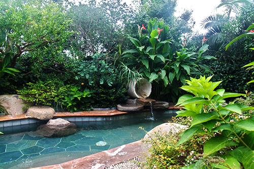 露天泳池?zé)釒эL(fēng)情,溫泉泡池仿若天成。露天泳池區(qū)景觀獨(dú)具特色,選用華棕、棕櫚、布迪椰子、加拿利海棗等熱帶植物作為主景,營造出簡約大方、層次分明的濃郁熱帶園林風(fēng)情。為了提高這些熱帶植物的成活率,降低后期的養(yǎng)護(hù)成本,這批植物都經(jīng)過馴化,較能適應(yīng)吳江的氣候條件。該區(qū)面積較大,從酒店的觀景平臺上往下看,泳池中間的小島就像彎彎的小船,仿佛要順流而下;水質(zhì)清澈見底,水底大面積的藍(lán)色和黃色玻璃馬賽克,營造出波光鱗鱗的效果,流動的線條瞬間充滿了生機(jī)和活力,整個泳池仿佛都動了起來。