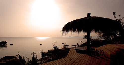 觀景平臺視野開闊,濱湖風(fēng)光水天一色。臨湖的觀景平臺,原色的木質(zhì)鋪裝,素樸的茅草亭,寬大的躺椅,營造出一個自在的小天地。這處觀景平臺,背后是珍珠泉泡池,泡完溫泉,可以直接來到觀景平臺,遠(yuǎn)眺太湖的煙波浩渺,水天一色。