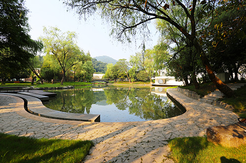 項目位于西湖區(qū)文一西路1000號,走在校園內(nèi),入目所及,豐富的植物組團與景石搭配的小景清新而自然;蜿蜒的園路旁,青青翠竹營造出幽靜的意境;溪水邊,古樸的亭子靜靜佇立成一道風(fēng)景,柳楊依依,花兒綻放,植物的倒影在水中清晰如畫,一幅婉約的江南水景圖徐徐展現(xiàn)在眼前。