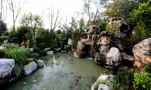 海綿城市是指城市能夠像海綿一樣,在適應(yīng)環(huán)境變化和應(yīng)對自然災(zāi)害等方面具有良好的“彈性”,下雨時吸水、蓄水、滲水、凈水,需要時將蓄存的水釋放并加以利用。展園內(nèi)采用碎石鋪就的“茶馬古道”,既能有限地補充地下水,又有一定的地表徑流削減作用。另外,園內(nèi)水池邊設(shè)置植被緩沖帶,通過植物攔截及土壤下滲作用有效減緩地表徑流流速,并去除徑流中的部分污染物,體現(xiàn)了海綿城市理念的截污凈化功能。