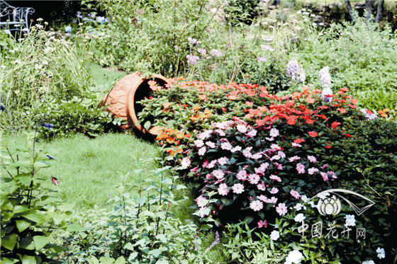 陶罐花溪景觀 以冰生溲疏為背景,通過陶罐的配置,組合搭配超級鳳仙‘桑蓓斯’、天竺葵、紫嬌花、粉花繡線菊、紅花鼠尾草、姬小菊、九頭獅子草、大花飛燕草等,形成以紅色調(diào)為主的陶罐花溪景觀。遠(yuǎn)遠(yuǎn)望去,仿佛一道絢麗的花海從陶罐中傾瀉而出,汩汩地流向遠(yuǎn)方。