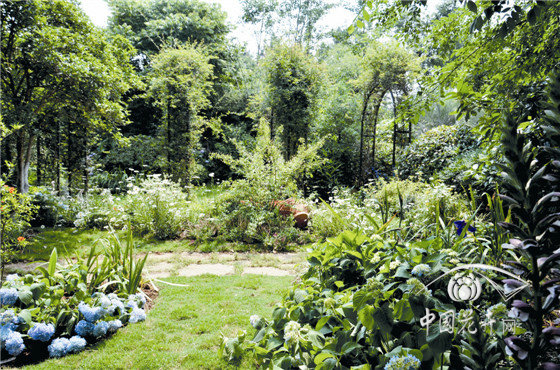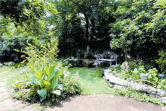 內(nèi)部八仙花花園,以櫸樹、景石、石籠擋墻及園路圍合成半開敞空間,以八仙花為主材,搭配鳶尾、石榴、落新婦、百子蓮等,組成3個花境組團(tuán),與白色座椅形成半私密的花園景觀。