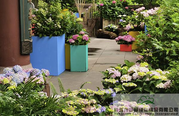 在城隍閣二樓平臺,杭園股份贊助的50余個品種、近400余盆的繡球花也將驚艷亮相,通過豐富的造景方式,充分展現(xiàn)繡球花的魅力。不管是種植在色彩明艷的花箱中,還是與枯木、竹籬笆、瓦片等的搭配,繡球都展現(xiàn)出絕美的風姿,吸引著人們探尋的目光,忍不住拿起相機或手機,留下一個個精彩瞬間。其中,花大色艷、色彩可調(diào)的大花繡球‘搖擺樂’、‘藍寶石’,矮小可愛,青澀潔白的圓錐繡球‘活力青檸’,花如寶塔、葉形如掌的重瓣櫟葉繡球‘雪花’等,是杭園股份今年主推的品種,表現(xiàn)都非常搶眼。