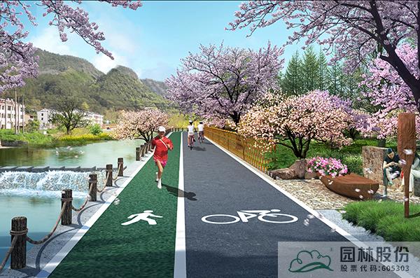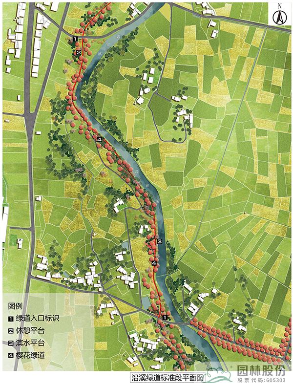 沿溪綠道為櫻花環(huán)中濱河段落,該標(biāo)準(zhǔn)段長度為730m,總長2590m。以春季櫻花為主題,打造浪漫的濱水慢行系統(tǒng),沿線打造休憩空間,設(shè)置休憩設(shè)施,并在入口處設(shè)計特色標(biāo)識,成為村民通行休閑健身的浪漫步道。
