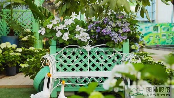▲園林股份自主選育的‘青山’系列繡球在畫境·青山湖花園中心室外景觀展示區(qū)中的應(yīng)用