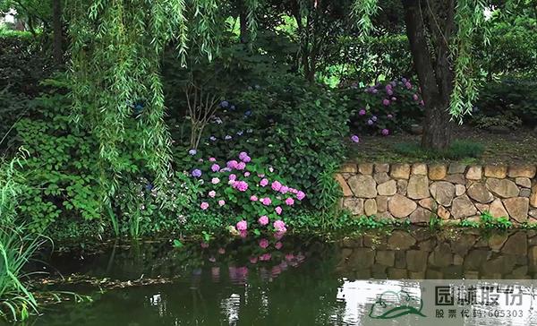 池水靜謐流淌,繡球微探,