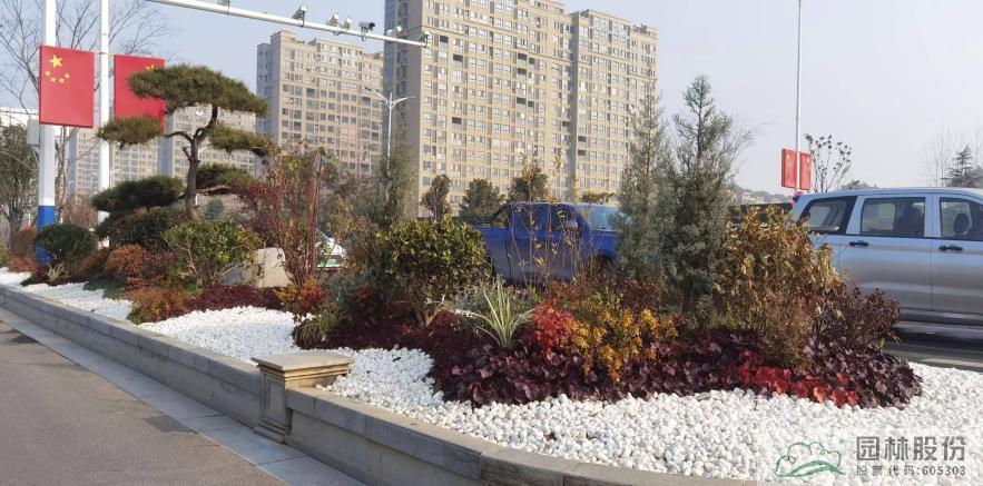 在江山大道與黃山路、黃浦江路與項(xiàng)王路路口在植物配置上,采用群落結(jié)構(gòu)、組團(tuán)配置和盆景化的自然式造園手法,在空間、色彩、節(jié)奏方面獨(dú)具匠心,打造了高低錯(cuò)落、疏密有致的和諧景觀。考慮到行車安全性與視線誘導(dǎo)因素??紤]到行車安全性與視線誘導(dǎo)因素,中央綠化隔離帶以黑松樁的種植片段和花鏡+球類的自然群落片段進(jìn)行循環(huán),打造規(guī)則中有自然的效果。機(jī)非綠化隔離帶以黑松樁+花鏡種植,打造艷麗的春景效果。