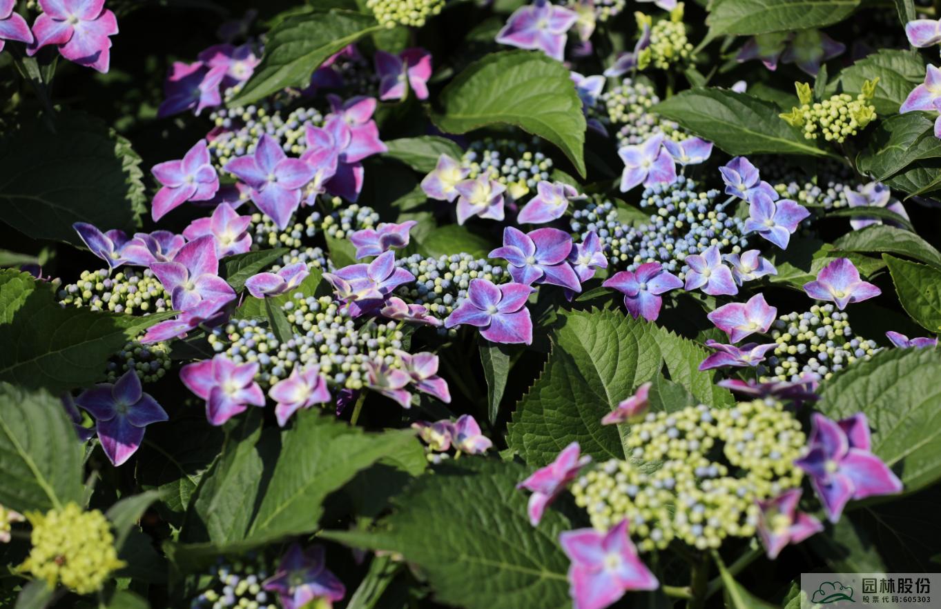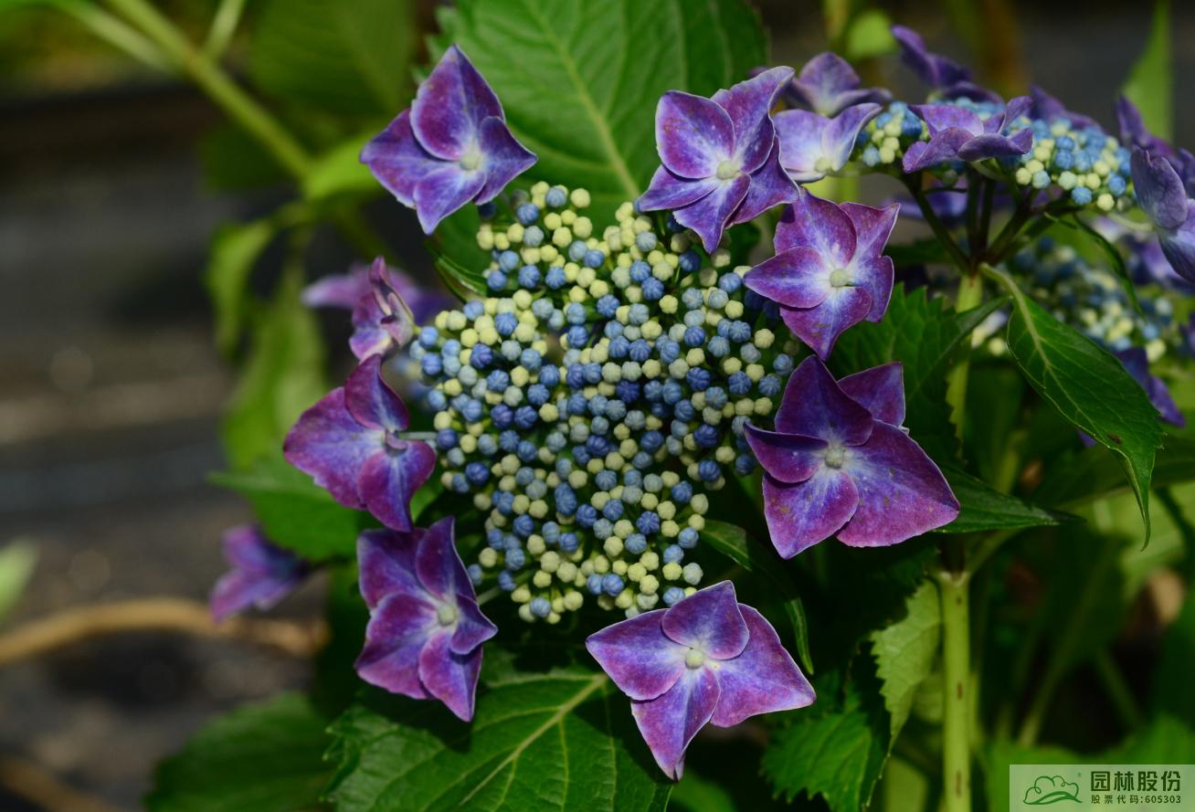 大葉繡球‘紫之夢’:傘房狀聚傘花序盤狀,高度2~4cm,直徑8~12cm,上海及杭州5月中下旬開花,可延續(xù)至6月下旬;不孕花主色紫紅色先端白色中部藍色,基部白色;可孕花花瓣藍色;花序直立性強,花色艷麗,花量大,開花能力強,適合家庭園藝和各式園林景觀。