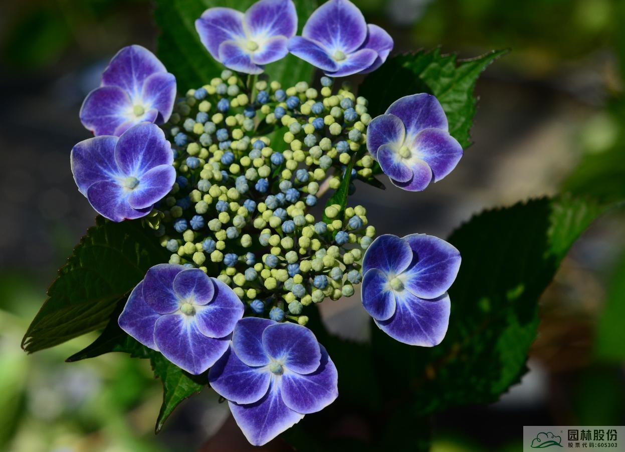 大葉繡球‘夢幻星空’:傘房狀聚傘花序盤狀,高度2~4cm,直徑10~12cm,上海及杭州5月中下旬開花,可延續(xù)至6月下旬;可孕花花瓣藍色;不孕花萼片先端白色至淺藍色中部藍色至紫色基部白色;花色夢幻,花型飄逸,適合家庭園藝和工程。