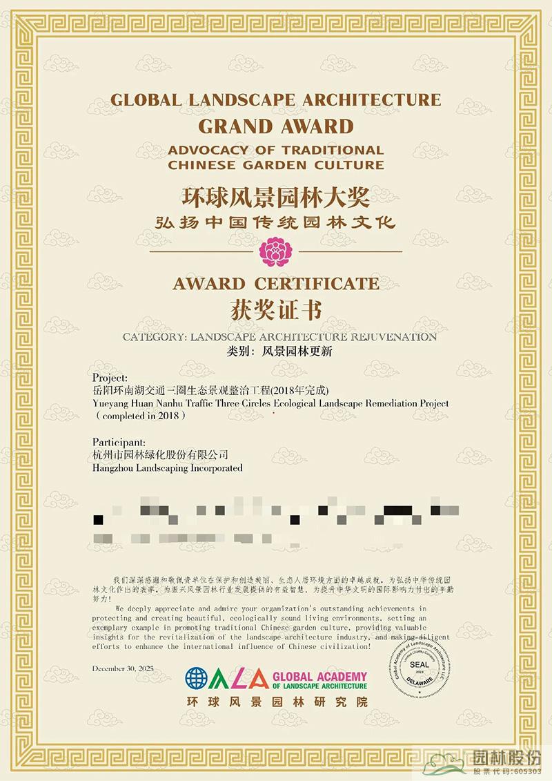 近日,環(huán)球風(fēng)景園林研究院公布 “環(huán)球風(fēng)景園林大獎(jiǎng)” 評(píng)選結(jié)果,杭州市園林綠化股份有限公司承建的岳陽環(huán)南湖交通三圈生態(tài)景觀整治工程、畫境園兩大精品項(xiàng)目,憑借卓越的設(shè)計(jì)營造水平與生態(tài)文化價(jià)值,雙雙斬獲風(fēng)景園林更新綜合類大獎(jiǎng),以硬核實(shí)力彰顯中國園林企業(yè)的專業(yè)水準(zhǔn)與文化擔(dān)當(dāng)!