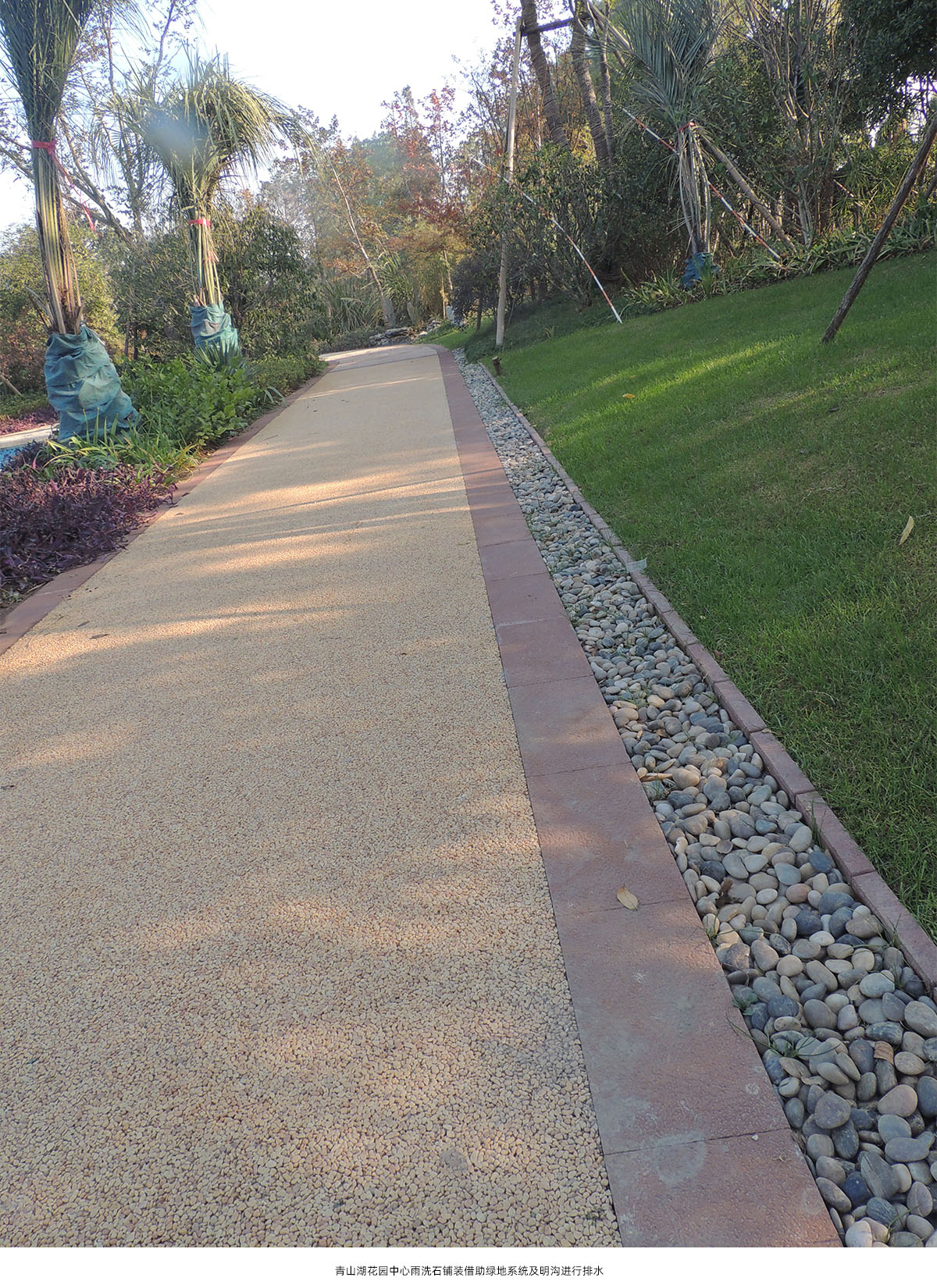 通過對鋪裝材料透氣性、生態(tài)性研究及鋪裝結(jié)構(gòu)層施工工藝改進(jìn)等措施,結(jié)合園林景觀地形處理、設(shè)置排水設(shè)施等手段,建立生態(tài)型鋪裝體系。